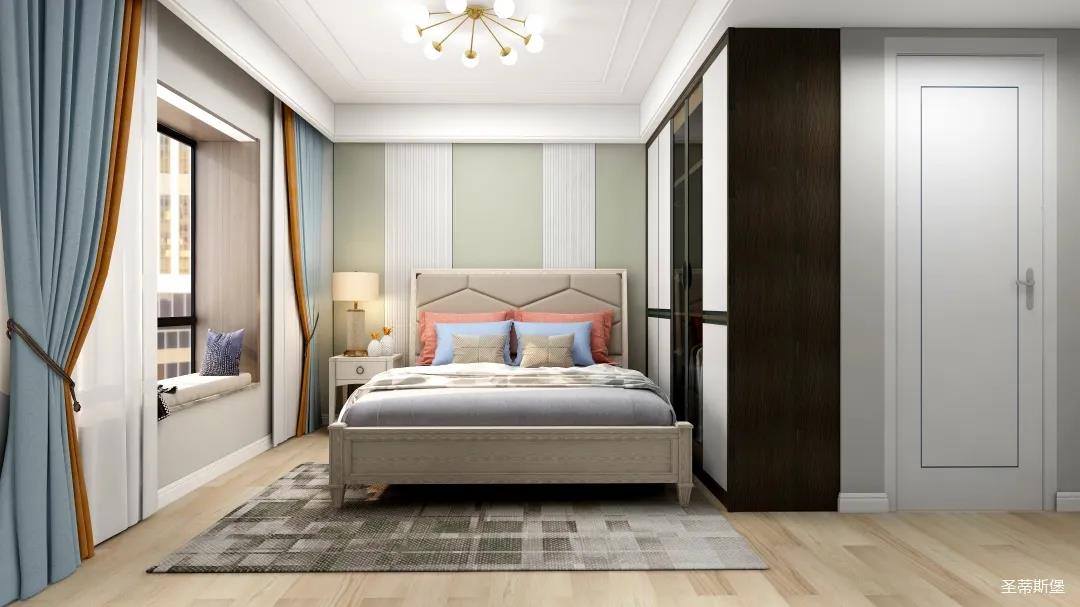 主卧的木饰护墙配以浅绿与鱼肚白相间,色彩清新自然,层次分明。实木质感与清新色彩,为休憩时刻注入强烈的氛围感与随性感。