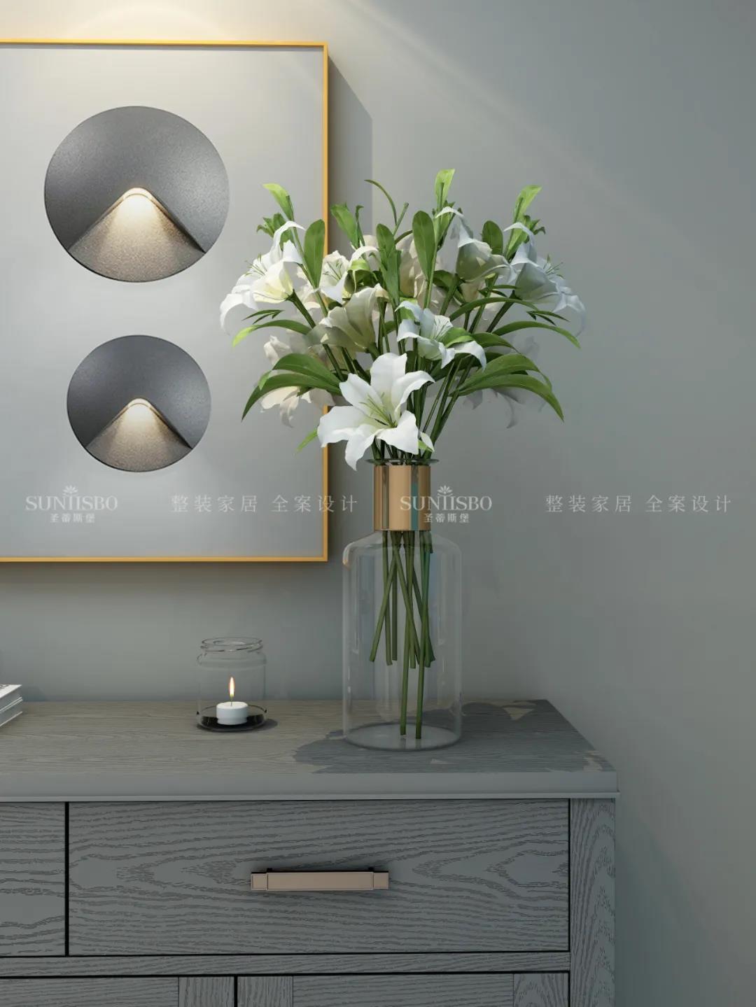 入户侧面设计一字型玄关,腰部,底部留空做层板,便于随手放置钥匙、鞋包等物品,中间留空设计为开放展示区,加上软装饰品点缀,达到业主对品质生活追求的理想状态。应女主人要求,玄关还加长延伸出妆镜和换鞋凳,让动线自然流畅。