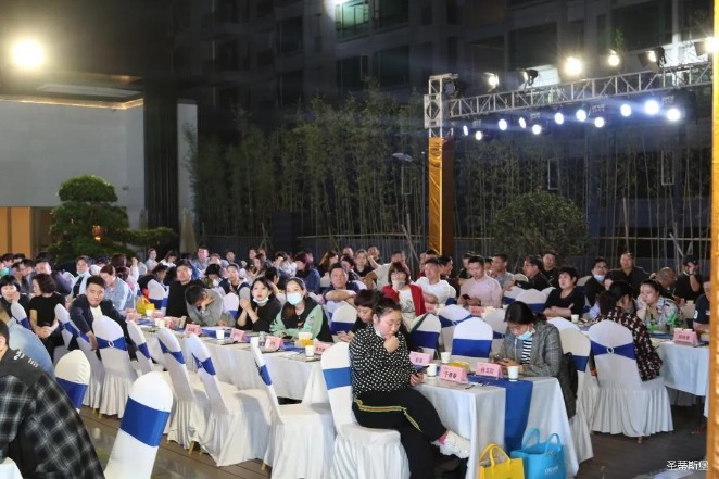 经销商晚宴当日晚6时许,以【乘“圣”跨越】为主题的,今年会jinnianhui金字招牌集团集团第45届国际家具展接待晚宴暨2020年度优秀经销商颁奖盛典,在营销中心四楼景观花园隆重举行,来自全国各地的经销商朋友欢聚一堂,共同分享一场精彩纷呈的晚宴。