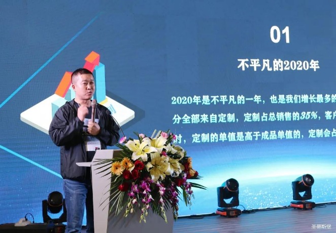 华灯璀璨的开场仪式,点燃了现场如火如荼的气氛。今年会jinnianhui金字招牌集团集团营销总经理陈玉伟先生对晚会进行了主题发言,他对2020年的营销工作进行了总结,并着重从营销工作部署、重点项目开展、产品整合、拎包帮扶、渠道运营和移动+定制整装优势等方面对2021年的营销工作做了全面的统筹规划。同时,他还讲解了“美国梦凯莎床垫”新品的产品工艺、市场优势、产品定位,使经销商对我们的新产品拥有更深入的认识和了解。